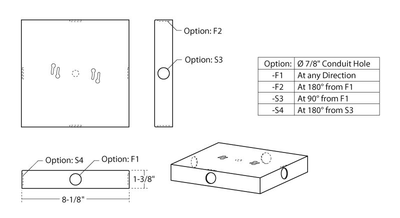 7" die-cast architectural surface mount square junction box for indoor locations only. Die-cast aluminum, 52 cubic-inch for a max of (18) #12 AWG wires. With up to (4) 7/8" holes for conduit fittings as described on Chart above.